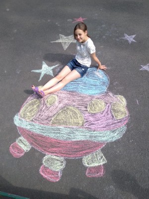 Ребята с большим увлечением играли цветными мелками, и вскоре асфальт на центральной площади лагеря покрылся красочными рисунками. В работах нашли отражение далекие планеты, космические корабли, покорители Вселенной и даже неизведанная летающая тарелка.