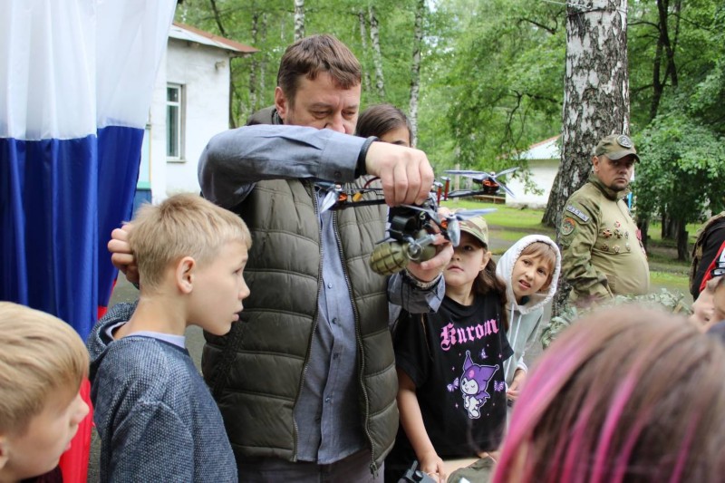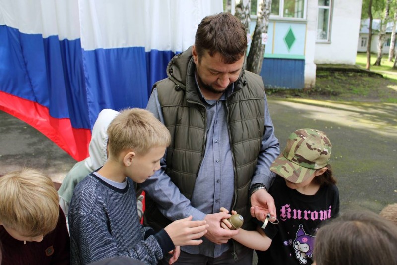 Огромный интерес детей вызвали экспонаты мобильной выставки «Кузбасс - Родина героев». Все желающие смогли примерить бронежилет и защитную каску, подержать в руках макеты оружия и гранат, поближе разглядеть настоящий военный дрон-камикадзе, укрыться под маскировочной сеткой и осуществить эвакуацию раннего.