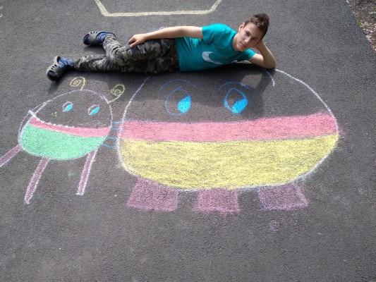 Ребята с большим увлечением играли цветными мелками, и вскоре асфальт на центральной площади лагеря покрылся красочными рисунками. В работах нашли отражение далекие планеты, космические корабли, покорители Вселенной и даже неизведанная летающая тарелка.