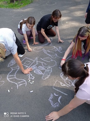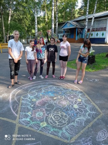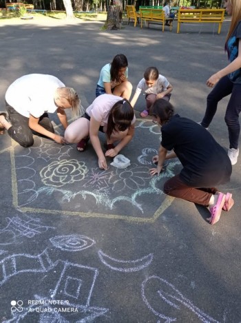 Фантазия детей не знала границ. На полотнах серого асфальта яркими красками расцветал волшебный мир цветов и насекомых. Настроение у всех было отличное, ребята были в восторге от «шедевров», которые у них получились.